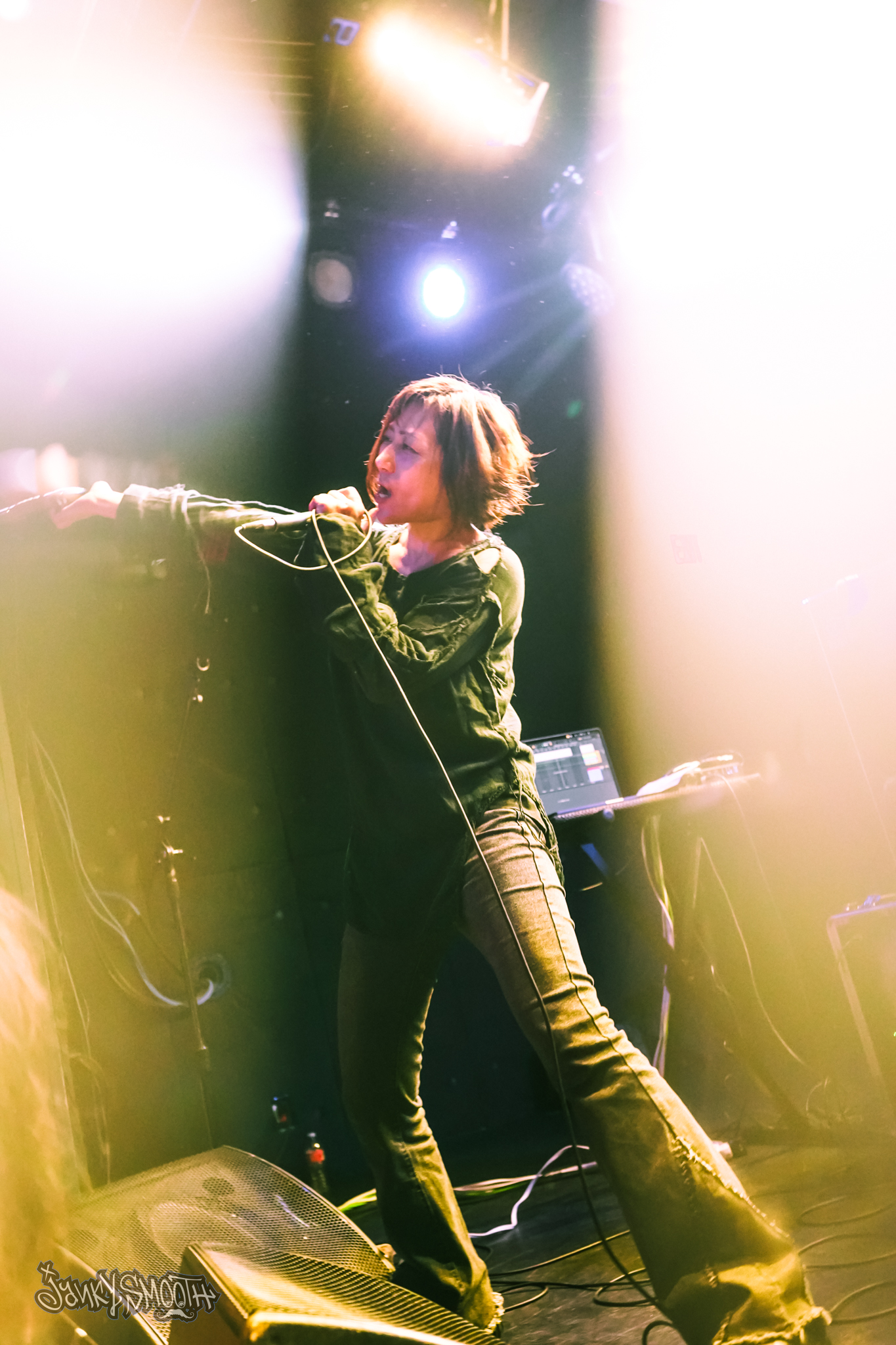 As Yako and Agata aka Melt Banana made their way on stage, fans erupted in a flurry of excitement, laced with mosh pit anticipation. During a brief montage of sound checks, Yako clicked away at her bright neon console, a series of blaring chiptune video game bleeps and blops followed close behind, unapologetically interrupting the silence. Grimy guitar riffs reverberated through the Teragram Ballroom, triggering fans to completely go mental. The smell of alcohol permeated the dance floor as bodies slammed against each other, desperately scrambling their way into the pit. Catapulting beverages sprayed the front row, while agro crowd-surfers squirmed along the audience, fluttering finger tips collectively elevated their torsos through the critical mass hell ride, like some revived pagan ritual.