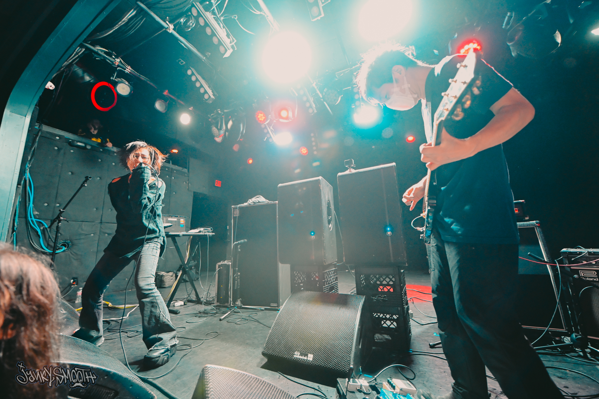 Breaking the tension after a few songs in, Yako referenced the upcoming rains hower headed for Los Angeles, then immediately transitioned into a sequence of Melt Banana’s signature 5-second melodies, bursting with ear-splitting shrieks and eccentric guitar tracks. A swift “thank you” from Yako disrupts each song like a malfunctioning robot spewing random programming bugs. The energy in the room continued to be electric, not because the band was polished, but because everyone there sensed something inherently primal occurring. The crowd wasn’t just watching Melt Banana; they were absorbing and reflecting the raw charge of the performance, like a feedback loop of excitement that would eventually spark into the encore.